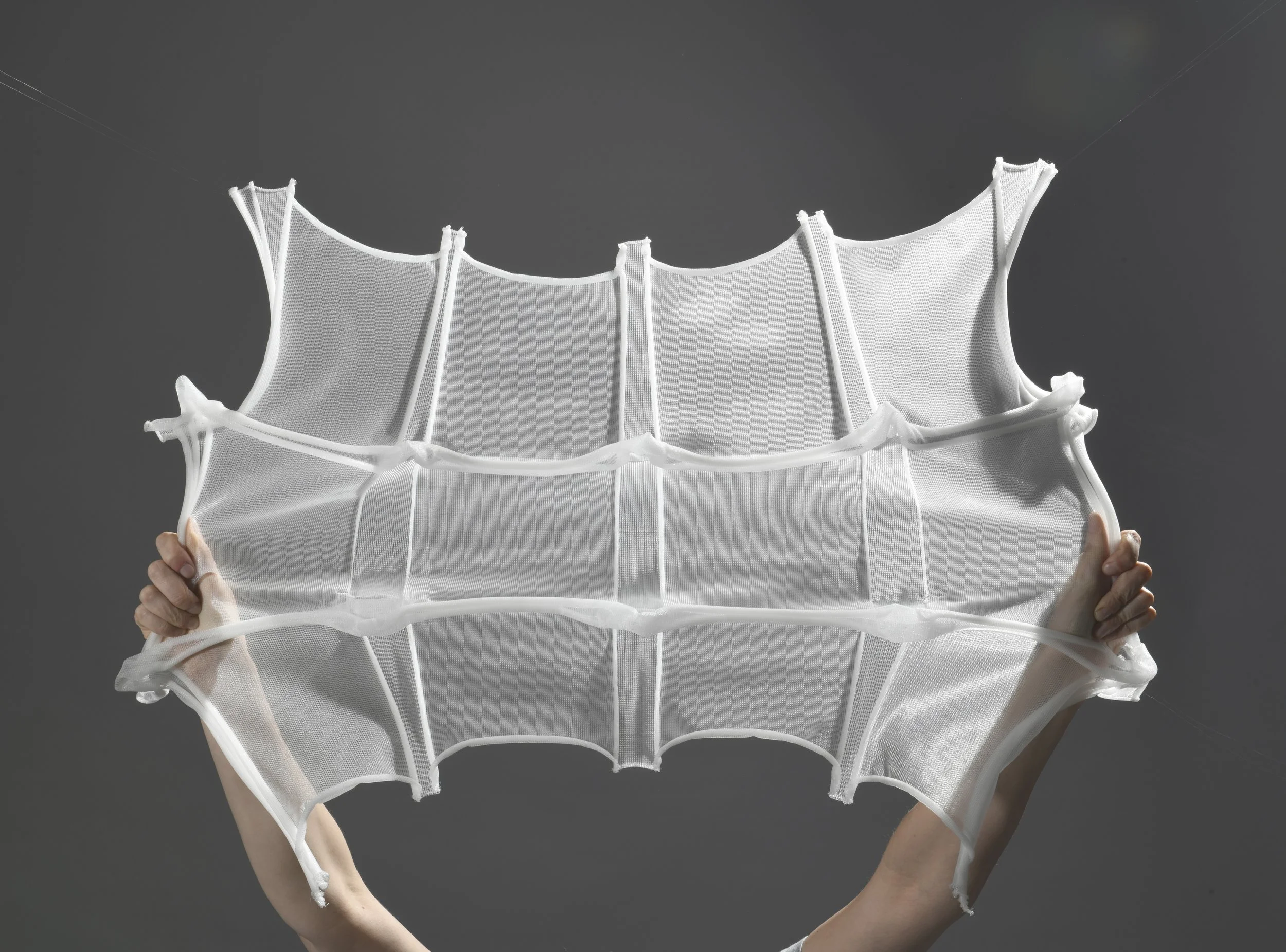The textile is stable yet transformable: it stretches in X and Y direction, interlocks, and forms three-dimensional configurations that can grasp, hold, and organize objects. Its properties are activated through direct interaction—manual manipulation defines its form and function.